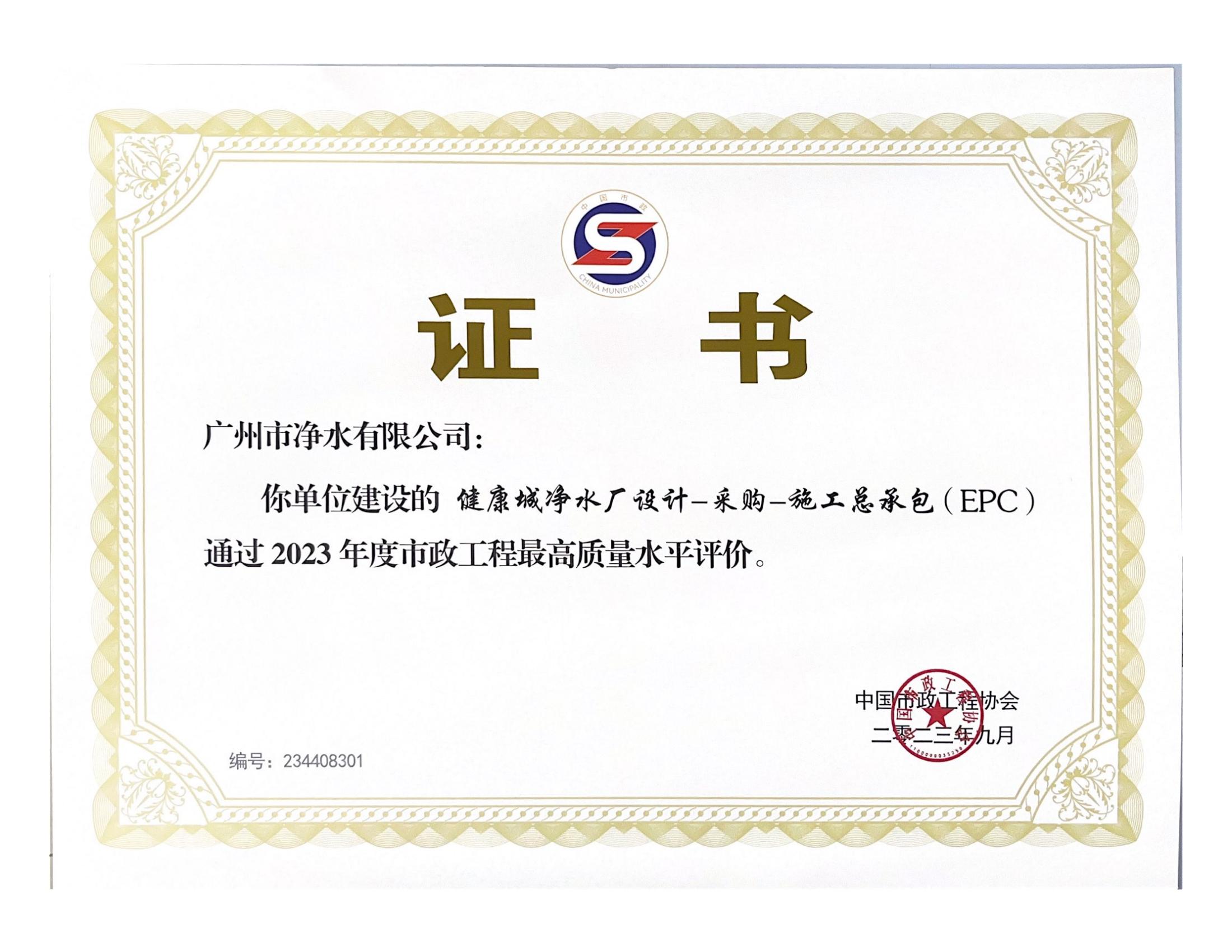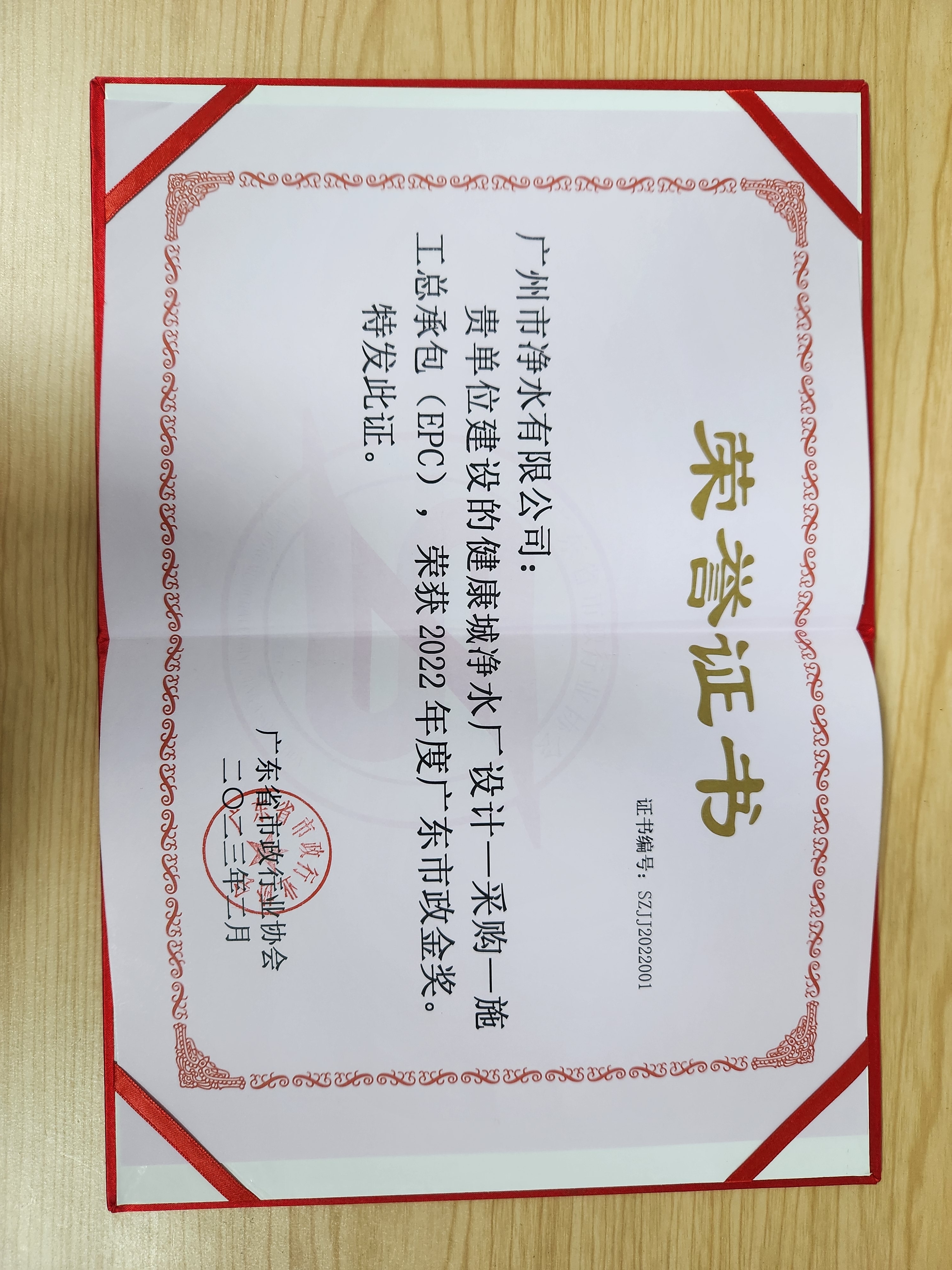 健康城凈水廠設(shè)計(jì)一采購一施工總承包(EPC),榮獲2022年度廣東市政金獎(jiǎng)