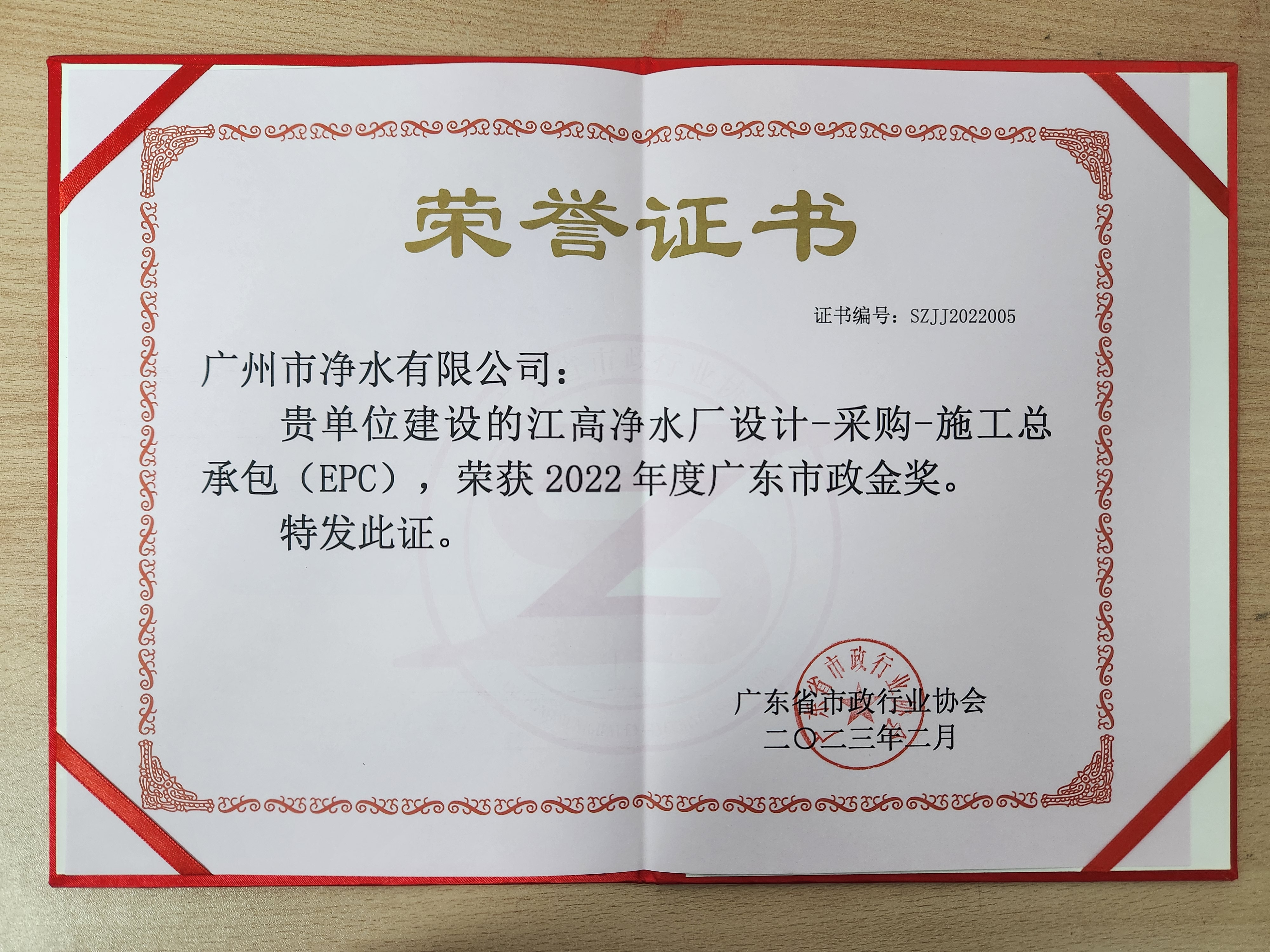 江高凈水廠設(shè)計(jì)一采購一施工總承包(EPC),榮獲2022年度廣東市政金獎(jiǎng)