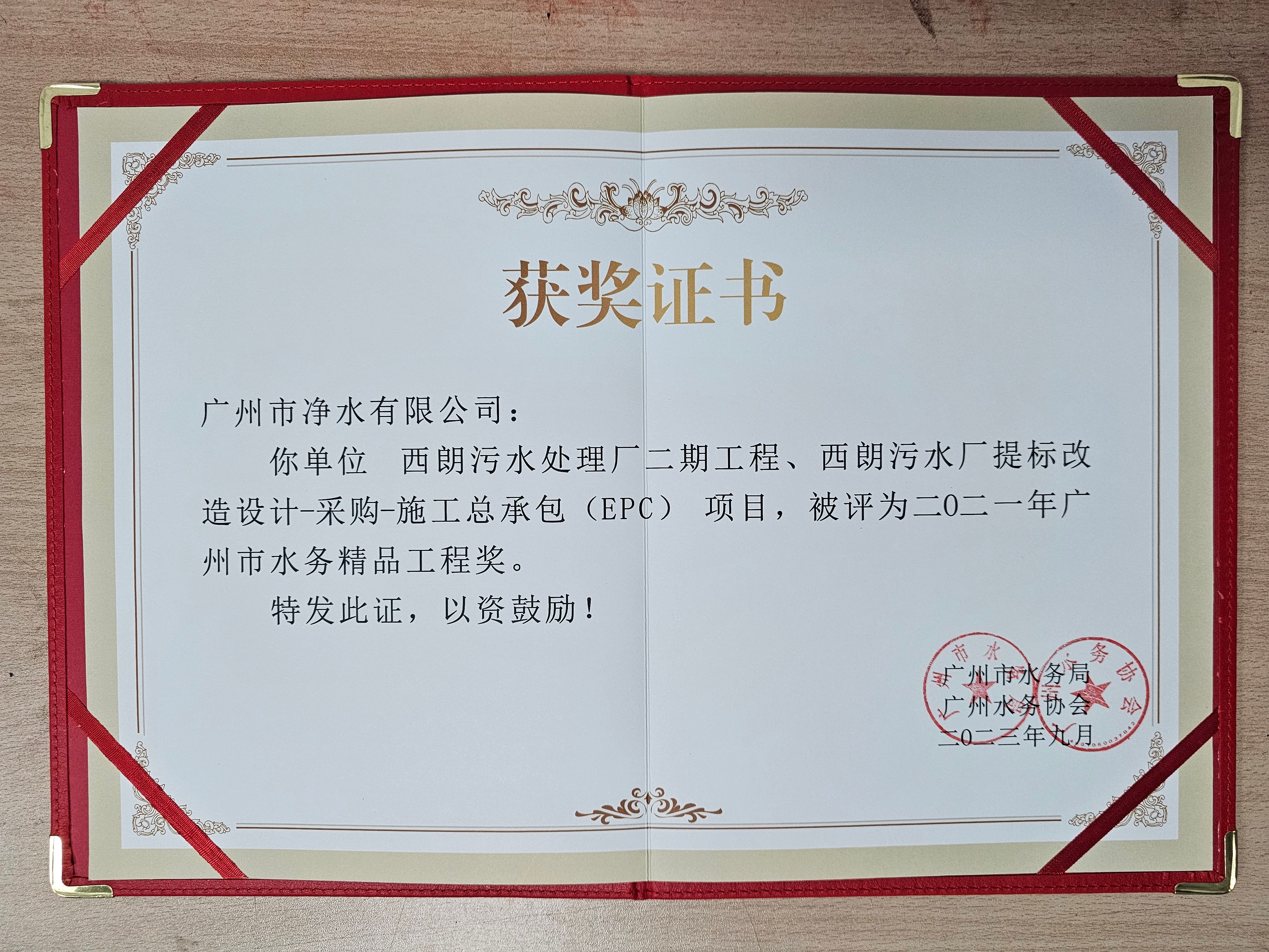 西朗污水處理廠二期工程、西朗污水廠提標(biāo)改造設(shè)計(jì)-采購-施工總承包(EPC)項(xiàng)目,被評(píng)為二0二一年廣州市水務(wù)精品工程獎(jiǎng)