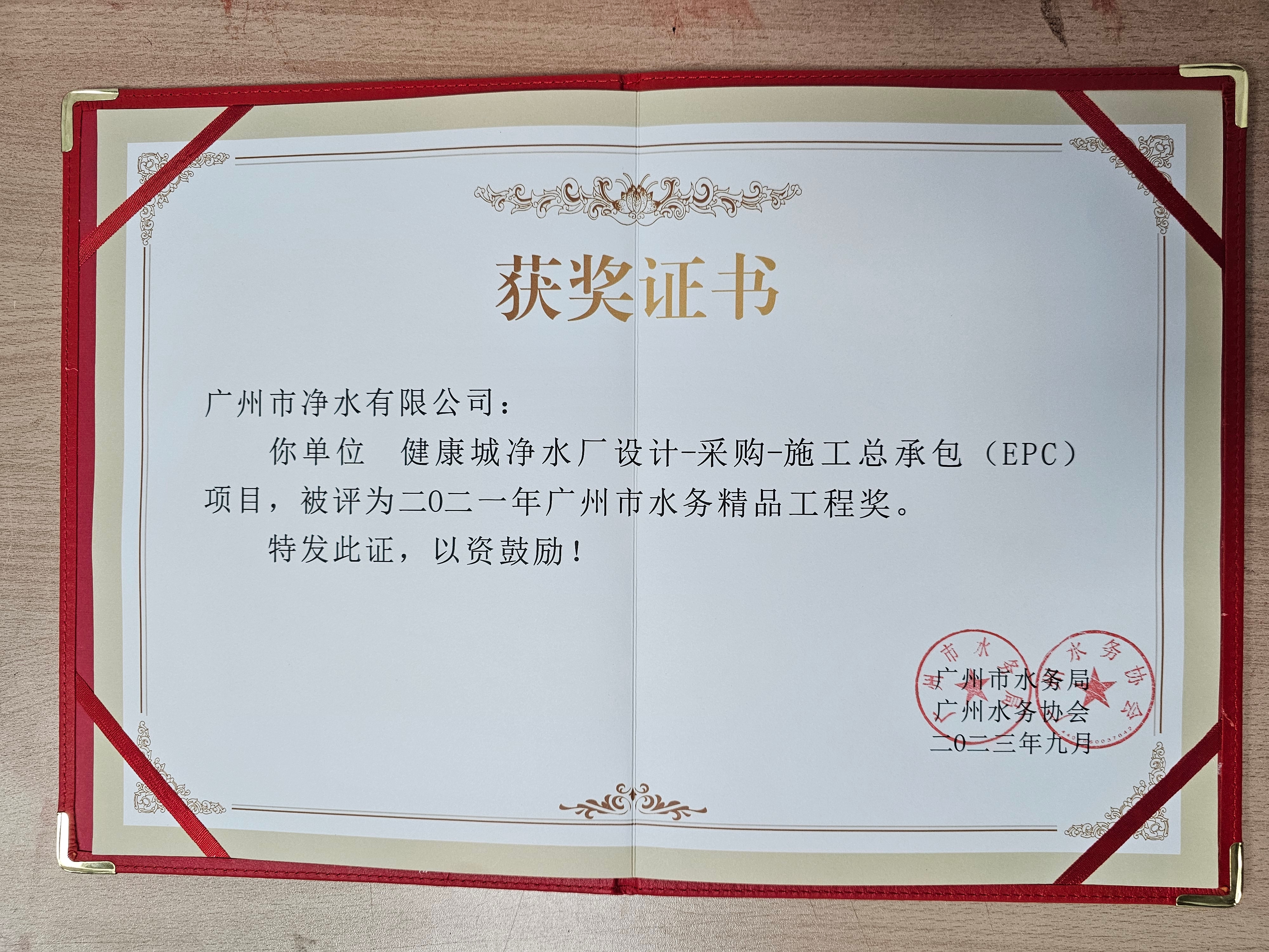 健康城凈水廠設(shè)計(jì)-采購-施工總承包(EPC)項(xiàng)目,被評(píng)為二0二一年廣州市水務(wù)精品工程獎(jiǎng)